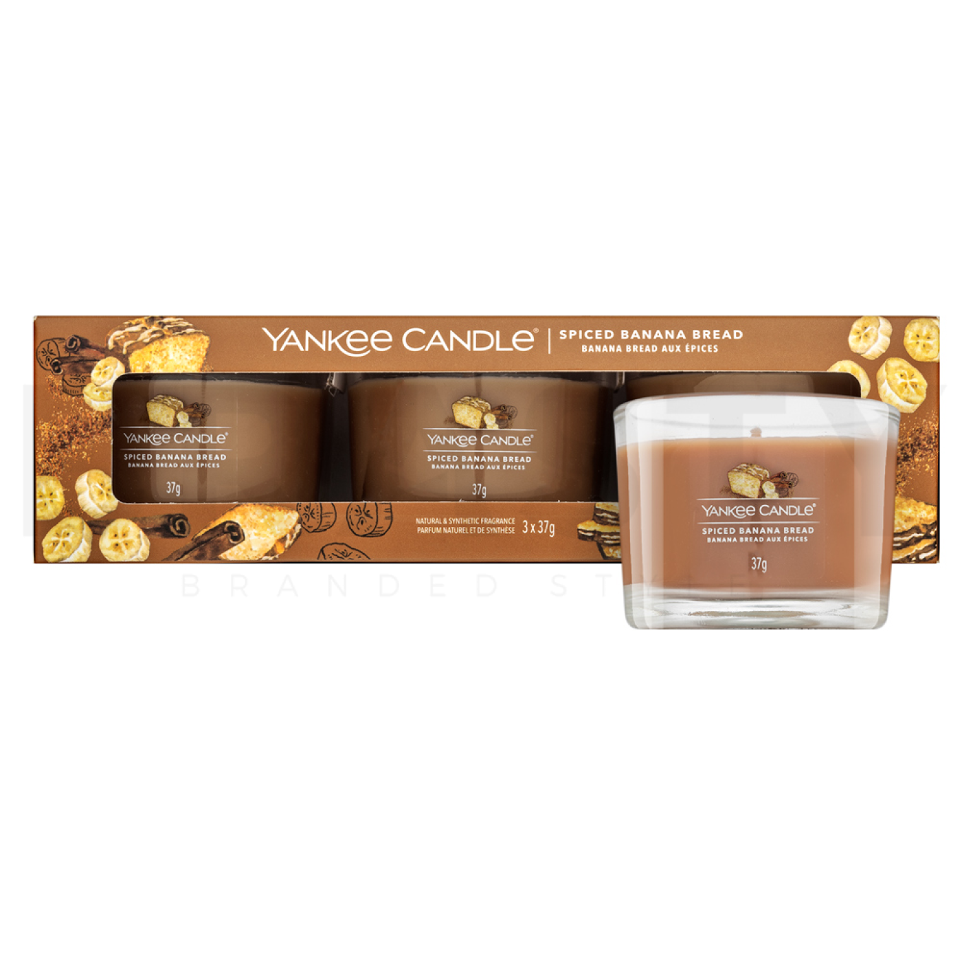 Вотивните свещи Yankee Candle Spiced Banana Bread са перфектни за моменти на релаксация или срещи с приятели. Техният сладък аромат създава приятна и уютна атмосфера, която е идеална за есенни вечери или зимни следобеди, прекарани с книга и чаша чай. Благодарение на памучния фитил, свещите горят чисто и равномерно, което осигурява максимално използване на аромата и дълго време на горене.